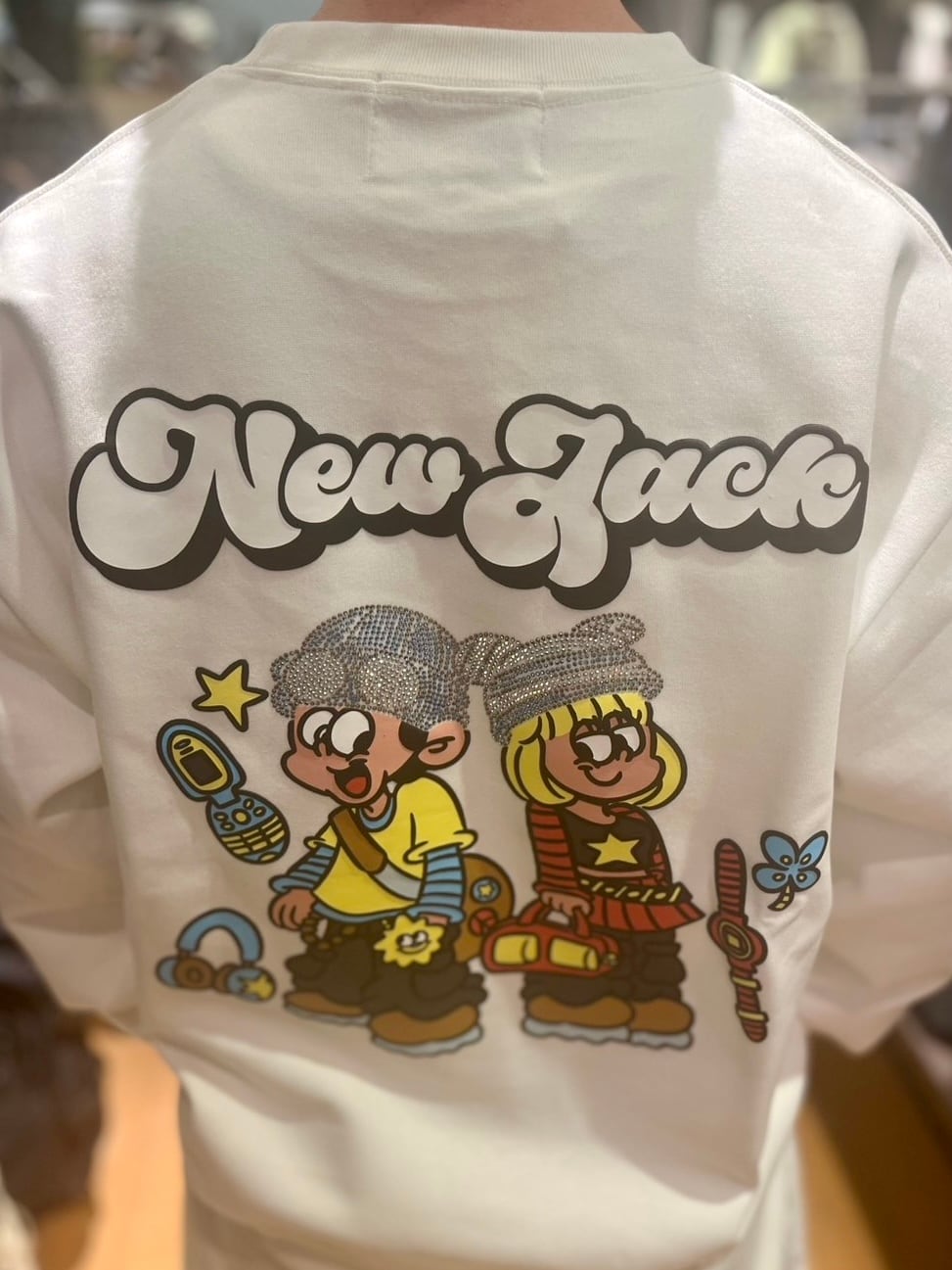NEW JACK ラインストーン付きトレーナーが登場!ストリート系ファッションに最適な、発泡プリントとラインストーンのコンビネーションが魅力の一品!華やかなディテールが目を引き、シンプルながらも個性的なスタイルを演出します◎